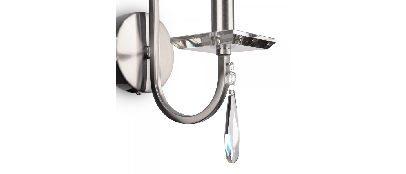 Металлическая арматура в двух оттенках: латунь и никель. Классическая форма плафона в виде свечи. Торшер и настольная лампа имеют тканевые абажуры. Белые – для арматуры цвета никель, оттенка кремовый шампань – для латунной. Декор – прозрачные хрустальные подвесы каплевидной формы. Торшер с цоколем Е..