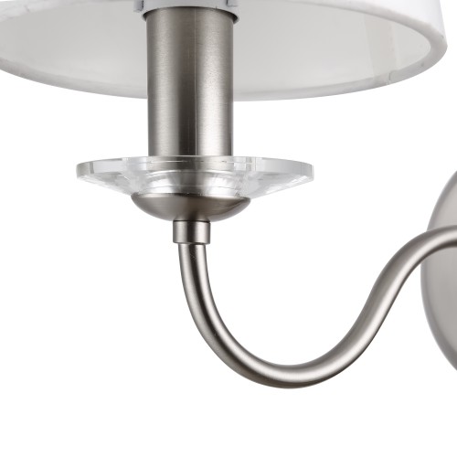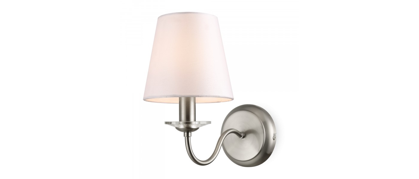 Металлическая арматура в двух оттенках на выбор: латунь и никель. Абажуры – текстиль белого цвета. Декоративные элементы из прозрачного стекла. Источник света – лампа с цоколем E14...