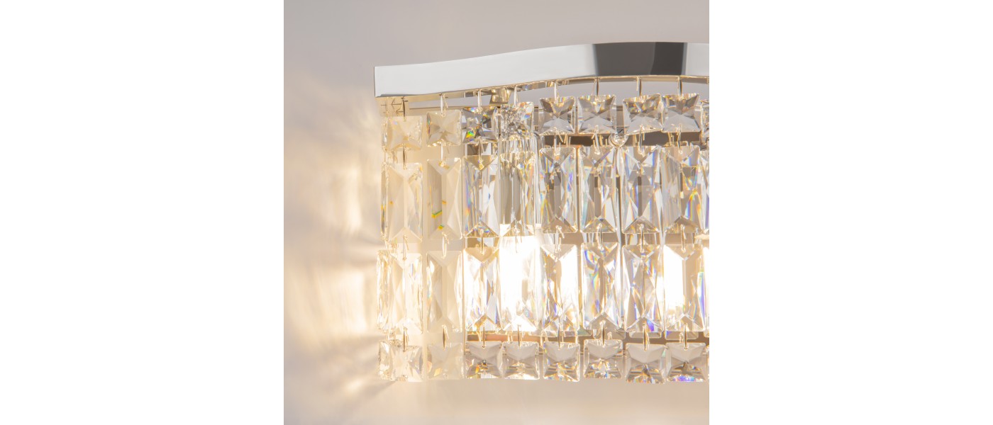 Металлическая арматура в двух оттенках: хром, золото. Декор – прозрачные кристаллы. Потолочные модели имеют два яруса подвесок. Высота подвесной люстры регулируется тросом...
