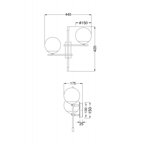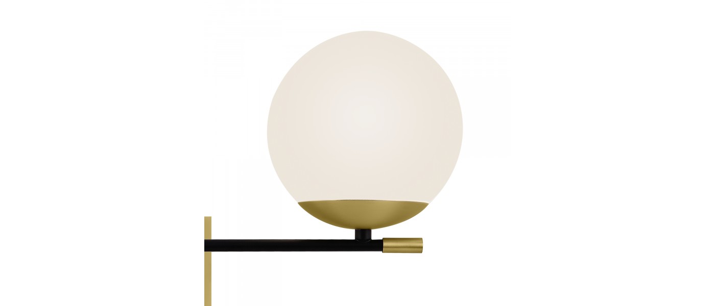 Арматура из металла в цвете матового золота. Плафоны-сферы из матового выдувного стекла. Модная асимметрия в дизайне. Источник света — лампы с цоколем Е14...