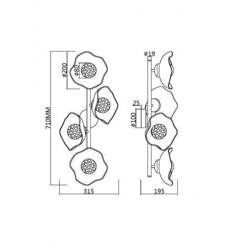 Арматура - металл, цвет - латунь. Плафоны-соцветия из литого стекла в плавных формах. Эффектные световые блики на плавных рельефах плафона. Источник света - лампа с цоколем G9. ..