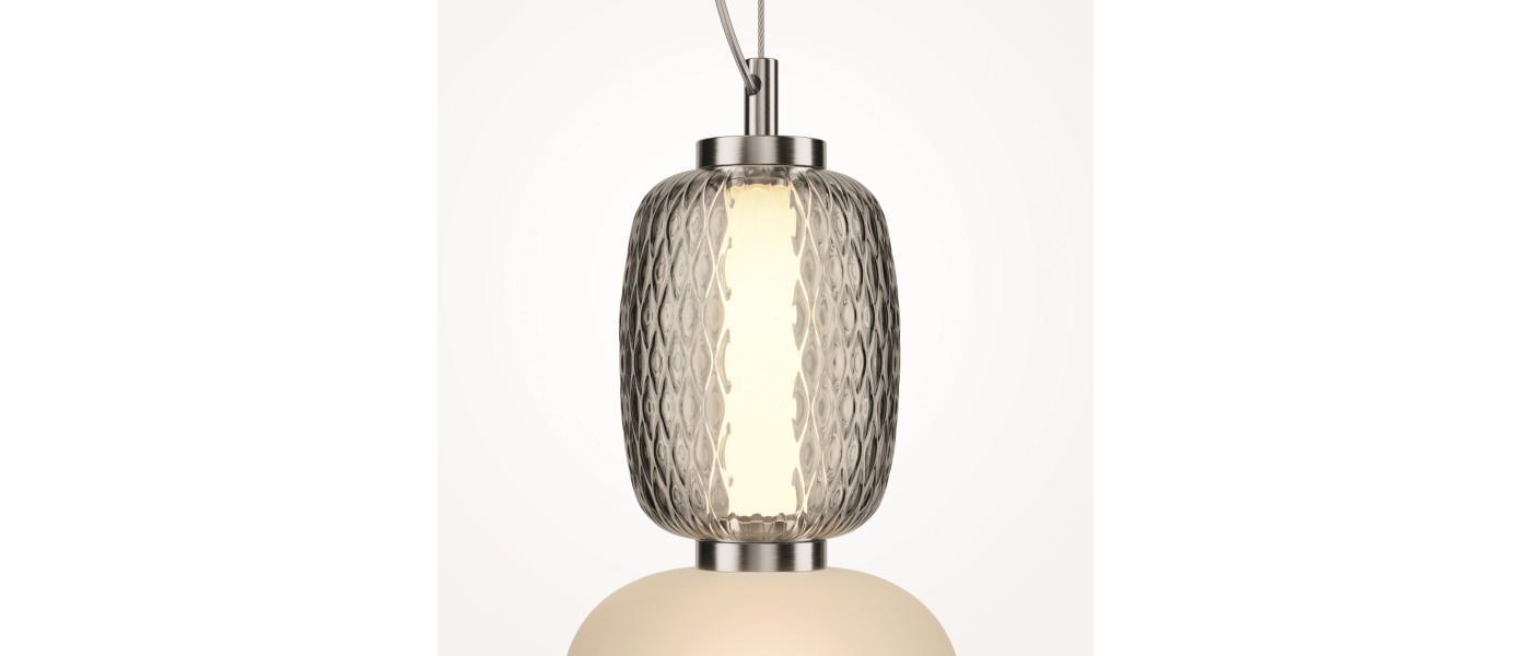 Металлическая арматура, цвет - золото, хром. Микс плафонов округлых и вытянутых форм из белого матового и прозрачного стекла с сетчатым и с линейным повторяющимся рельефным рисунком. Регулируемая высота подвесных моделей, провод - 3 метра. LED-источник света, цветовая температура 3000К...