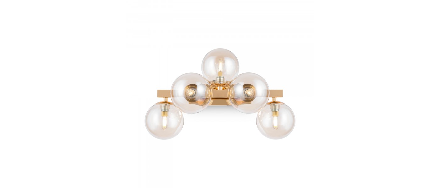 Металлическая арматура в четырех цветах: матовый черный, хром, золото, латунь. Плафоны — выдувное стекло. Цвета — дымчатый, янтарный, коньячный. Дизайн с имитацией молекулярной структуры. Высота подвесных светильников регулируется тросом. Лампа с цоколем G9...