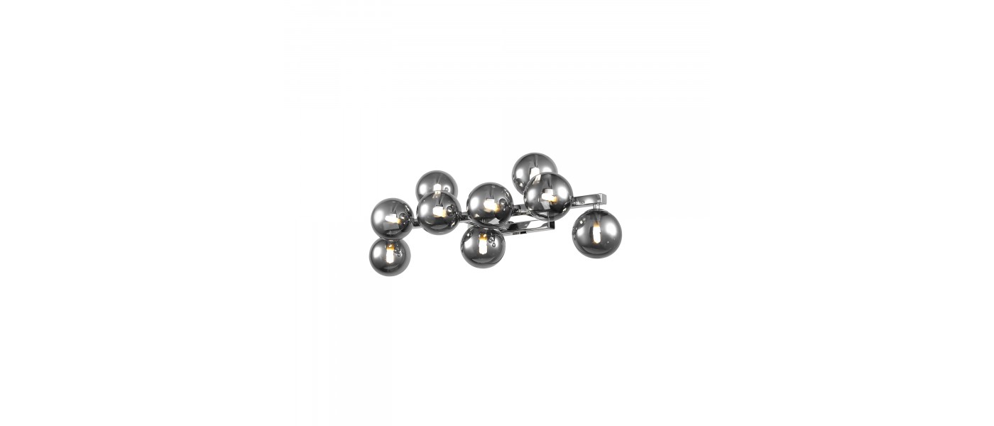 Металлическая арматура в четырех цветах: матовый черный, хром, золото, латунь. Плафоны — выдувное стекло. Цвета — дымчатый, янтарный, коньячный. Дизайн с имитацией молекулярной структуры. Высота подвесных светильников регулируется тросом. Лампа с цоколем G9...
