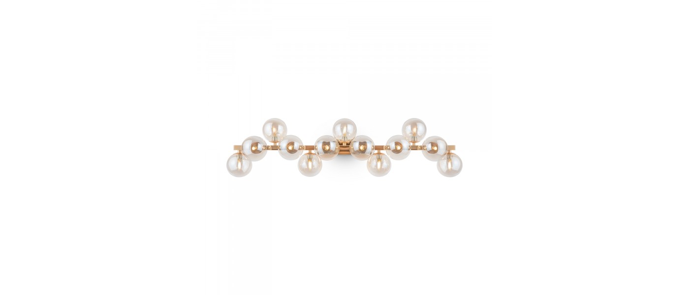 Металлическая арматура в четырех цветах: матовый черный, хром, золото, латунь. Плафоны — выдувное стекло. Цвета — дымчатый, янтарный, коньячный. Дизайн с имитацией молекулярной структуры. Высота подвесных светильников регулируется тросом. Лампа с цоколем G9...