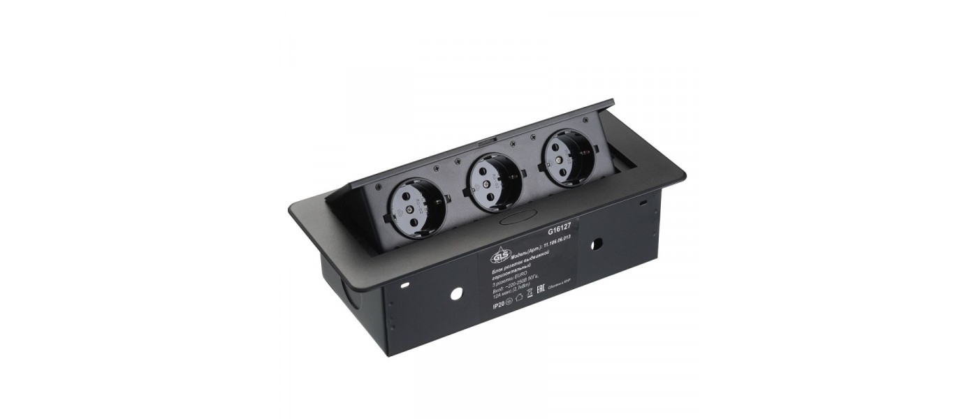 **Блок розеток выдв. вертик. Compact, ЧЕРНЫЙ, 3 розетки EURO, 250В, макс.3.5кВт 11.103.08.013