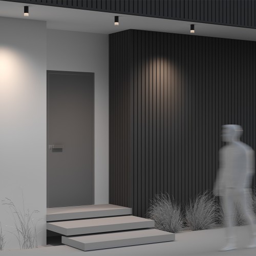 Материал арматуры - алюминий, цвет - черный и белый. Потолочный светильник, LED-источник света, цветовая температура 3000К, два размера, два цвета и две мощности (5Вт и 10Вт), высокая степень защиты от пыли и влаги IP65, высокий индекс цветопередачи >90...