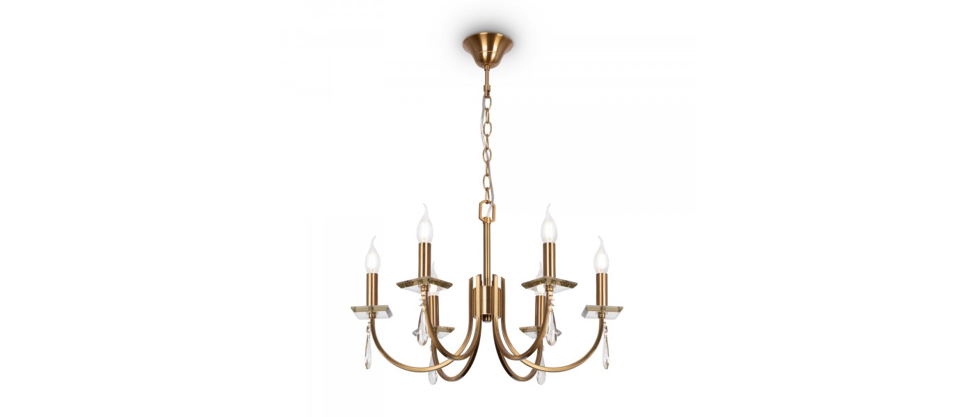 Металлическая арматура в двух оттенках: латунь и никель. Классическая форма плафона в виде свечи. Торшер и настольная лампа имеют тканевые абажуры. Белые – для арматуры цвета никель, оттенка кремовый шампань – для латунной. Декор – прозрачные хрустальные подвесы каплевидной формы. Торшер с цоколем Е..
