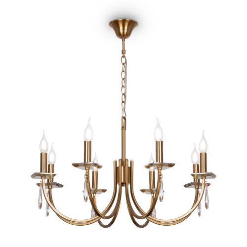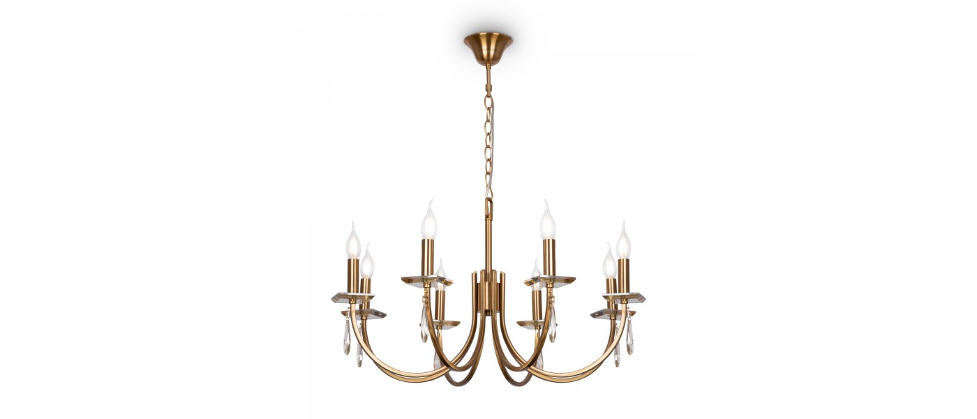 Металлическая арматура в двух оттенках: латунь и никель. Классическая форма плафона в виде свечи. Торшер и настольная лампа имеют тканевые абажуры. Белые – для арматуры цвета никель, оттенка кремовый шампань – для латунной. Декор – прозрачные хрустальные подвесы каплевидной формы. Торшер с цоколем Е..