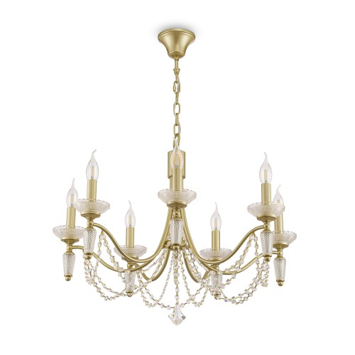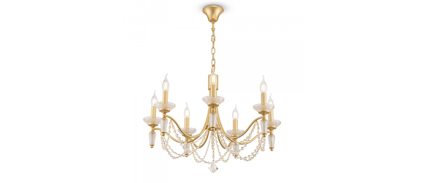 Металлическая арматура в двух оттенках: латунь и никель. Классическая форма плафона в виде свечи. Торшер и настольная лампа имеют тканевые абажуры. Белые – для арматуры цвета никель, оттенка кремовый шампань – для латунной. Декор – прозрачные хрустальные подвесы каплевидной формы. Торшер с цоколем Е..