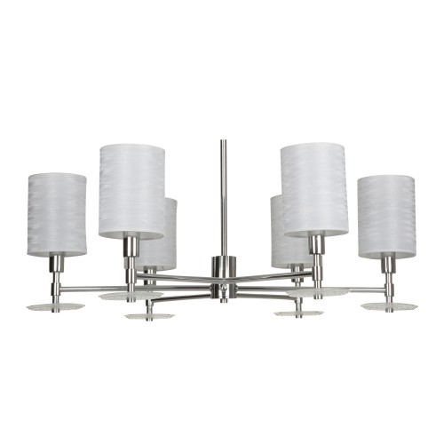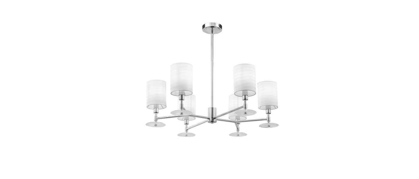 Простой каркас из никелированного металла образован сочетанием горизонтальных и вертикальных линий. Он украшает декоративные блюдца из прессованного стекла. Отдельного внимания в конструкции светильников заслуживают абажуры, сделанные из ткани на ПВХ. Они добавляют светильникам элегантности и тепла...