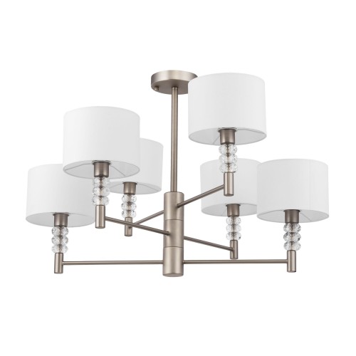Металлическая арматура, оттенки – латунь, белый с золотом. Модели с открытыми источниками света и с абажурами. Абажуры из органзы, оттенки – бежевый, белый. Закрученный по спирали декор центральной оси. Подвески из кристаллов. - Высота люстр регулируется. Источник света - лампа с цоколем Е14...