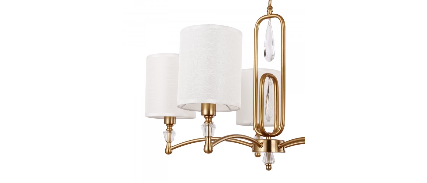 Материал арматуры – нержавеющая сталь, цвет – хром. Материал абажуров – текстиль на ПВХ, цвет – белый. Декор – прозрачное стекло. Акцентные стеклянные кристаллы на рожках со сложной огранкой...