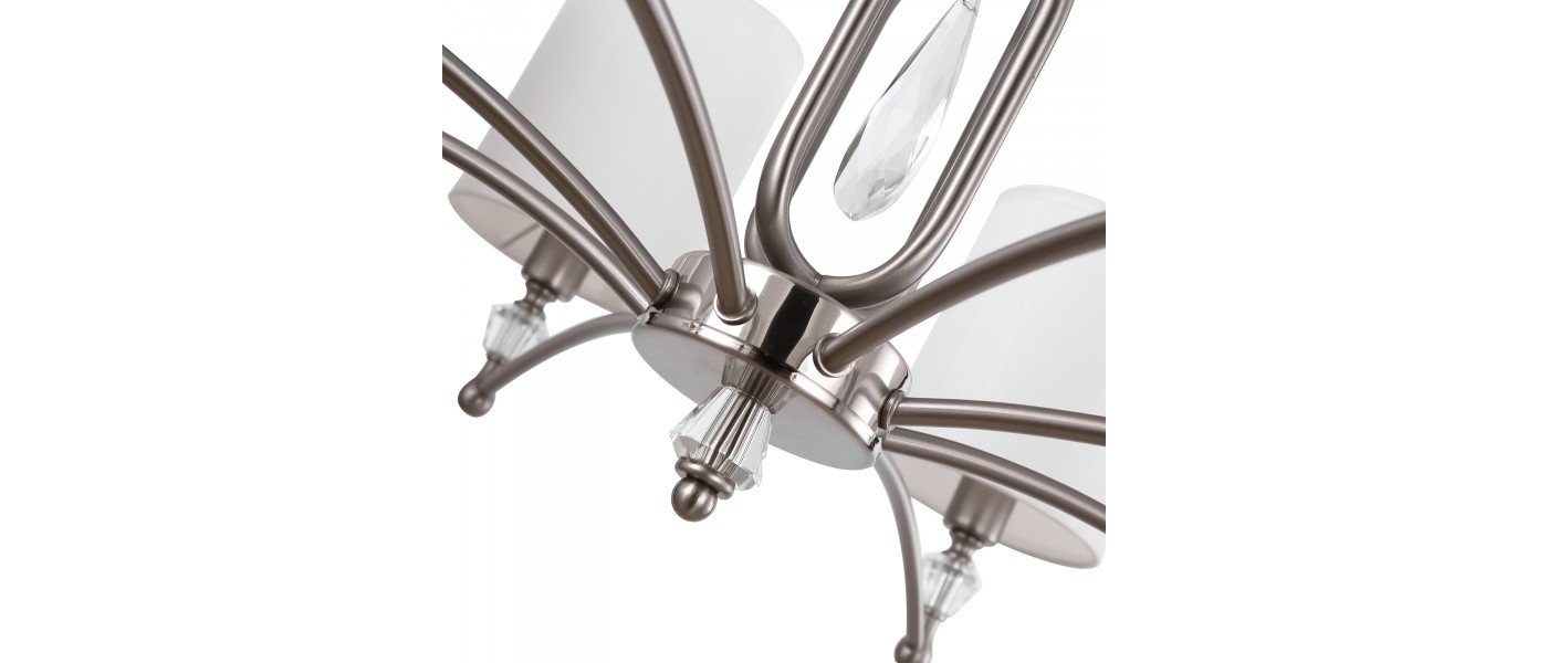 Материал арматуры – нержавеющая сталь, цвет – хром. Материал абажуров – текстиль на ПВХ, цвет – белый. Декор – прозрачное стекло. Акцентные стеклянные кристаллы на рожках со сложной огранкой...