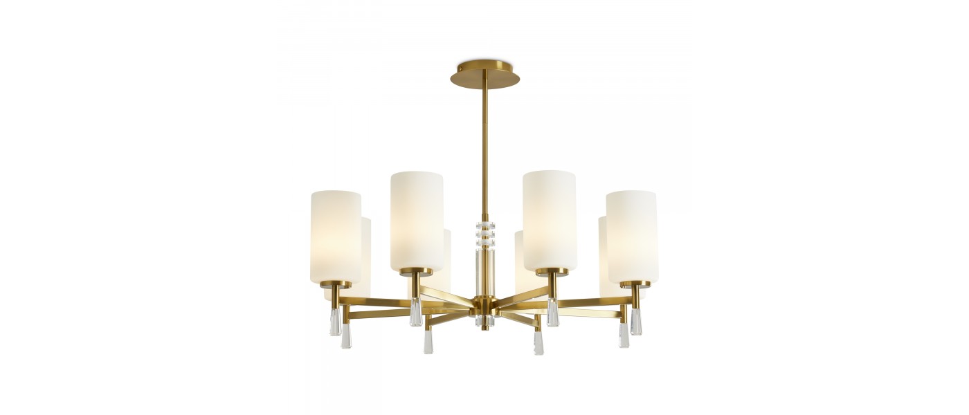 Арматура металл. Цвет латунь. Стеклянные белые плафоны хорошо рассеивают свет, направлены вверх, тем самым вытягивают потолок. Декоративные элементы в виде хрустального основания и капель из акрила. Источник света — лампа. Цоколь E27...