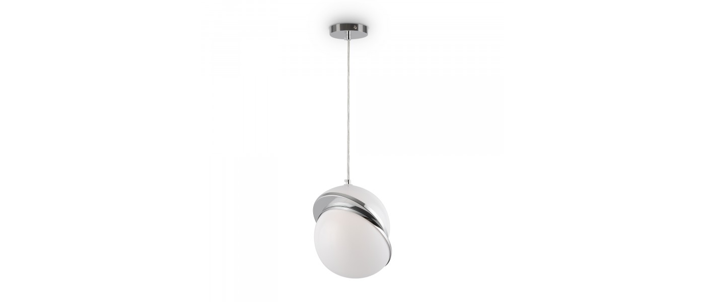 Металлическая арматура. Оттенки – хром, латунь. Плафон – матовое белое стекло с металлическим кантом. Футуристический дизайн, трендовая асимметричная форма. Заменяемый источник света, цоколь Е27...
