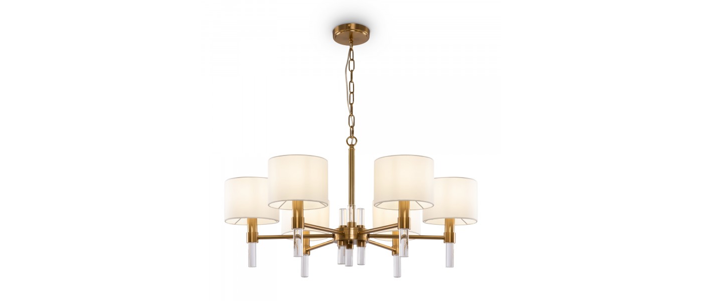 Металлическая арматура. Цвет – латунь. Тканевые абажуры белого оттенка. Декор – прозрачные акриловые трубки. Трендовая комбинация фактур и материалов. Широкий ассортимент. Торшер и подвес с цоколем Е27, лампа, бра и люстры – Е14...