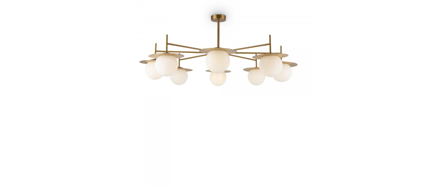 Арматура из металла, цвет – латунь. Плафоны сферической формы из матового белого стекла. Плоские розетки с эффектом чеканки. Трендовый микс фактур. Источник света – лампа с цоколем Е27...