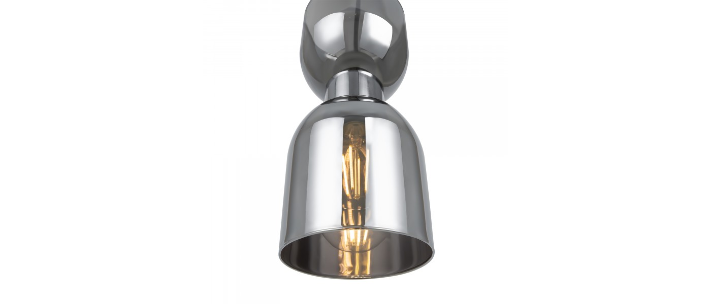 Хромированная металлическая арматура. Стеклянный плафон гальванизирован в тон арматуре. Трендовый арочный силуэт. В качестве источника света используется лампа с цоколем Е27...
