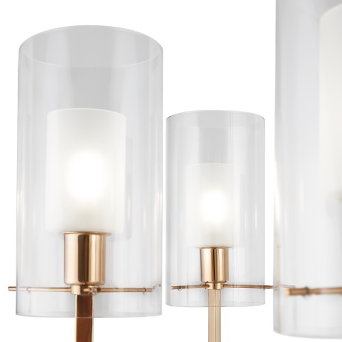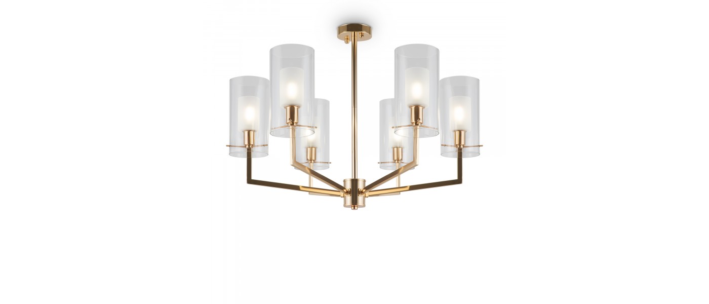 Металлическая арматура оттенка французского золота. Двойные стеклянные плафоны: матовые внутри, прозрачные снаружи. Лаконичная геометрия с симметричным расположением элементов. Источник света – лампа с цоколем E14...
