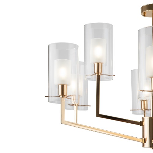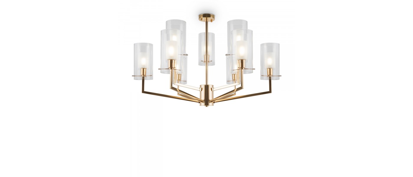 Металлическая арматура оттенка французского золота. Двойные стеклянные плафоны: матовые внутри, прозрачные снаружи. Лаконичная геометрия с симметричным расположением элементов. Источник света – лампа с цоколем E14...