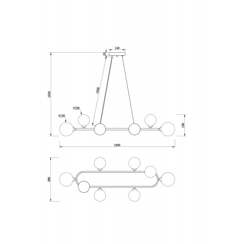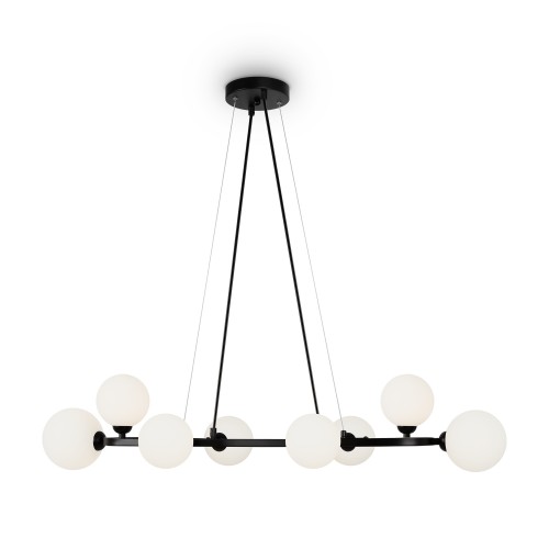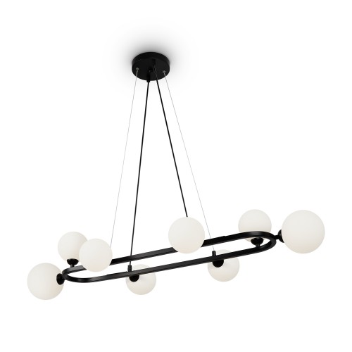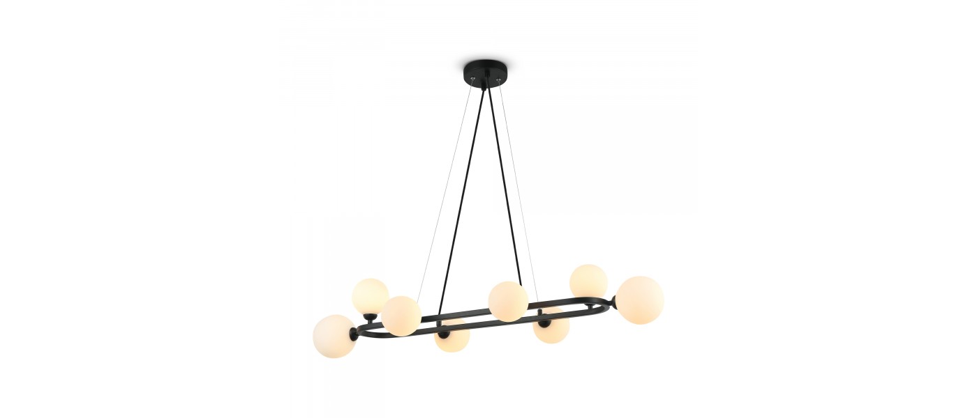 Металлическая арматура, цвета - черный и золотой. Плафоны-сферы из стекла 2х оттенков - матовый белый, полупрозрачный дымчатый - расположены на вытянутом металлическом каркасе, обеспечивая равномерный свет. Тонкие тросы придают светильнику эффект парения. Источник света - лампа с цоколем G9...