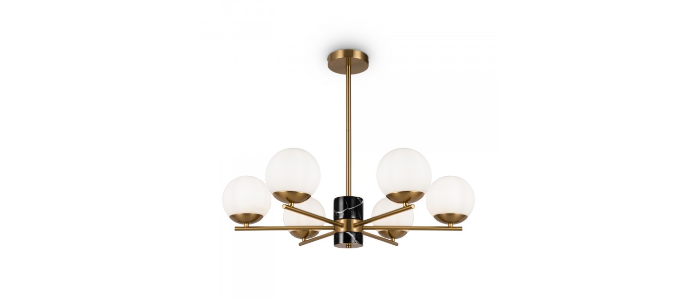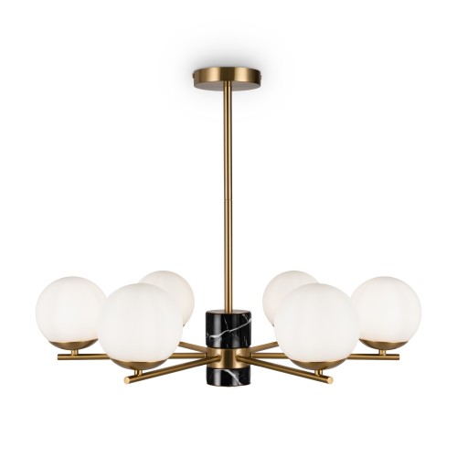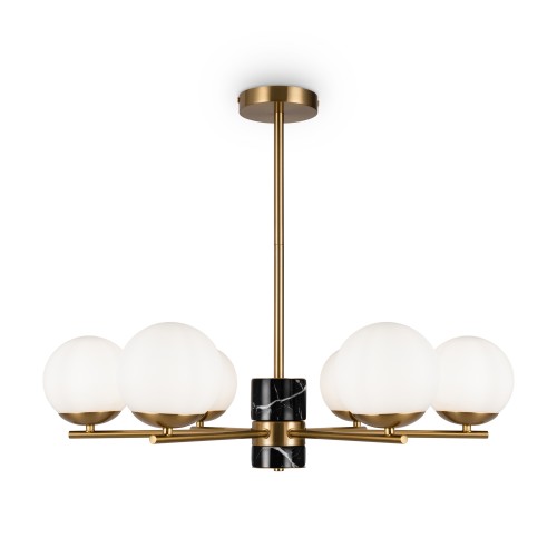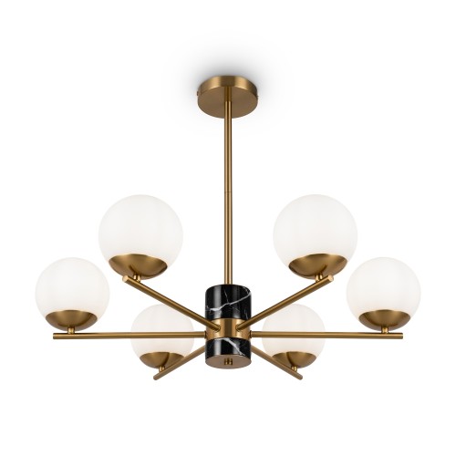 Арматура - металл, цвет - латунь. Мраморные черные элементы в основании. Плафоны-сферы из белого матового стекла с металлической апликацией у основания крепления в цвет арматуры. Сменямый источник света - лампы с цоколем Е27...