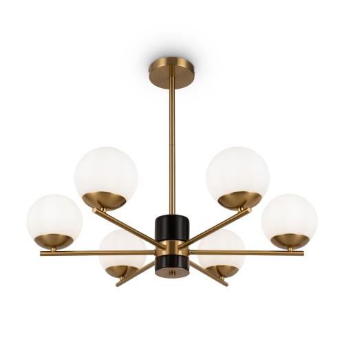 Арматура из металла. Цвет – латунь. Плафоны – матовое белое стекло. Трендовая геометрия в дизайне: арматура «пронизывает» плафоны-сферы. Источник света – лампа с цоколем Е27...