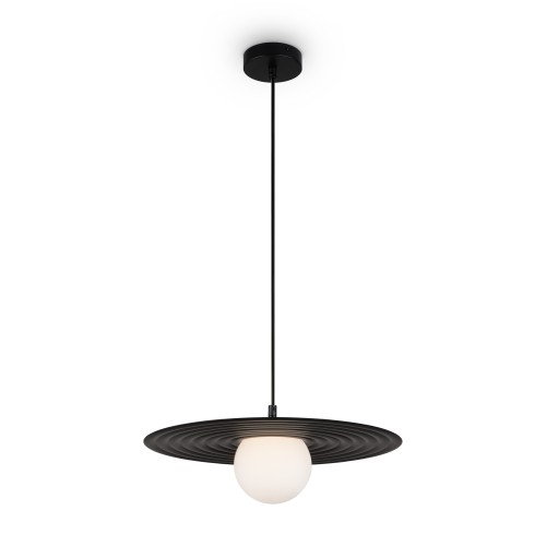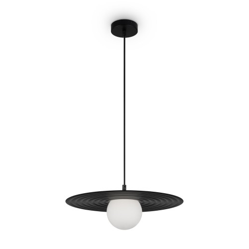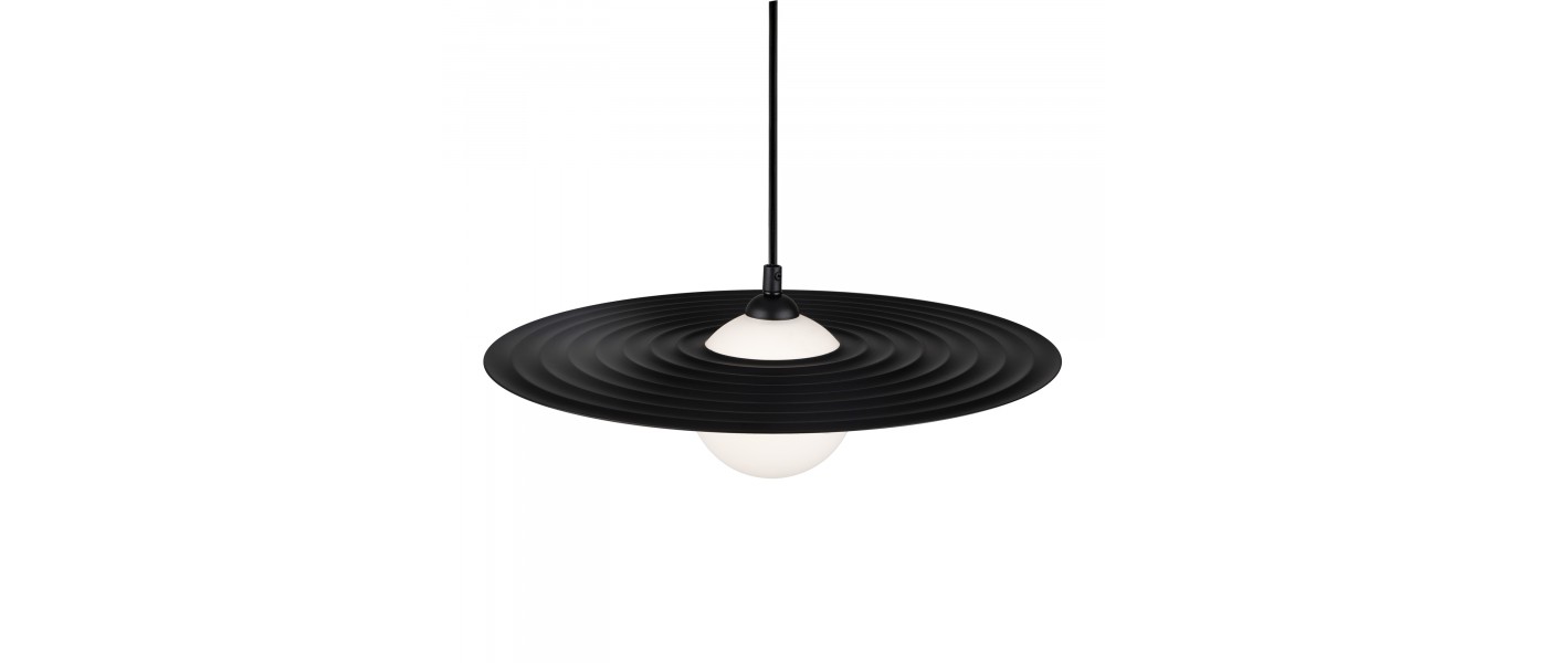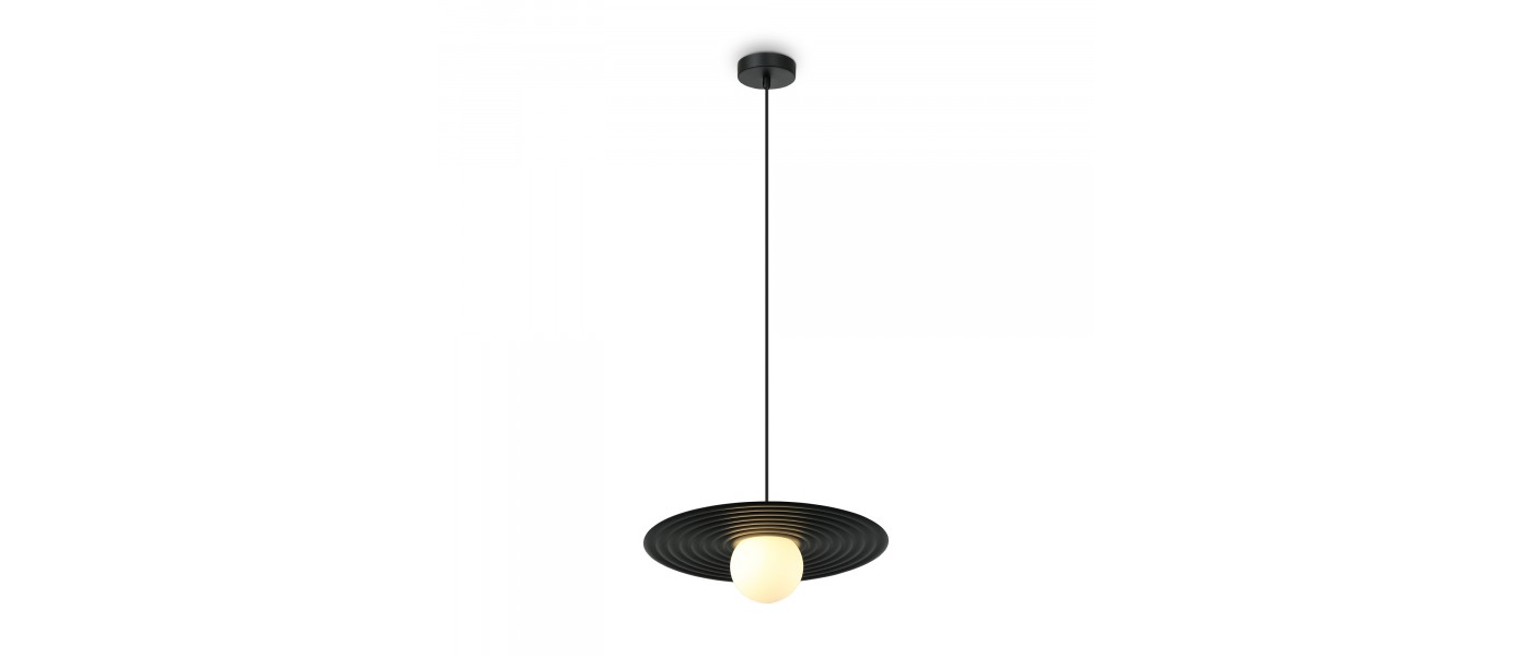 Арматура — металл, цвета — чёрный и белый. Матовый белый плафон с декоративным элементом — металлической тарелкой. Можно регулировать минимальную и максимальную высоту. Лампа с цоколем G9 служит источником света...