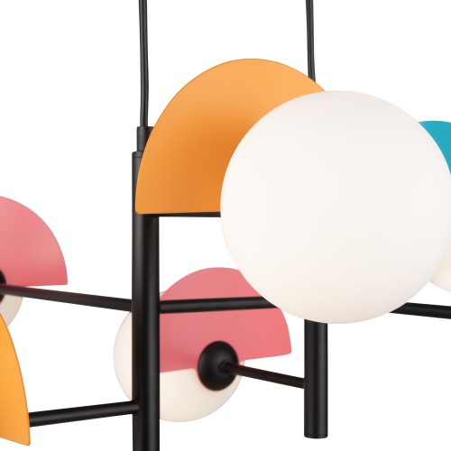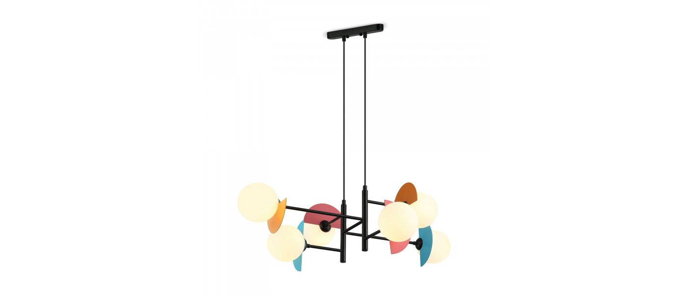 Арматура — металл, цвет — разноцветный или латунь. Белые матовые плафоны из стекла украшены металлическими золотыми или цветными лепестками. Динамичный дизайн для интерьеров в стиле Мемфис. Разнообразие форм в одной конструкции позволяет создать яркое освещение в больших комнатах. Высота регулируетс..