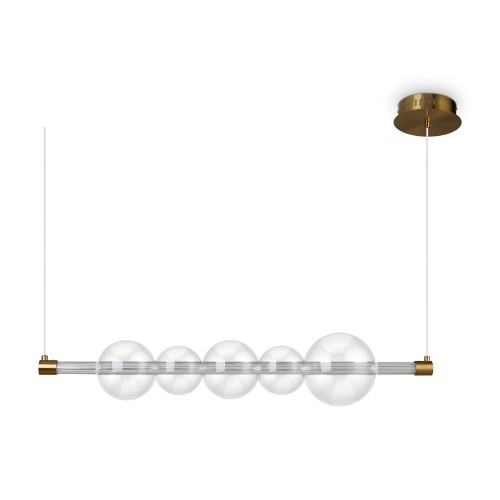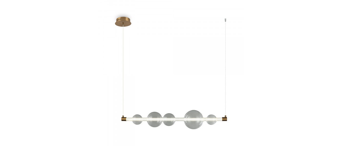 Арматура - металл, цвет - латунь. Стеклянные плафоны в виде сдвоенных матовых “шариков” дополнены широкими декоративными плафонами из стекла двух оттенков: дымчатый и янтарный. LED-источник света. Цветовая температура - 3000К. Светильники подойдут для светлых интерьеров и детских комнат...