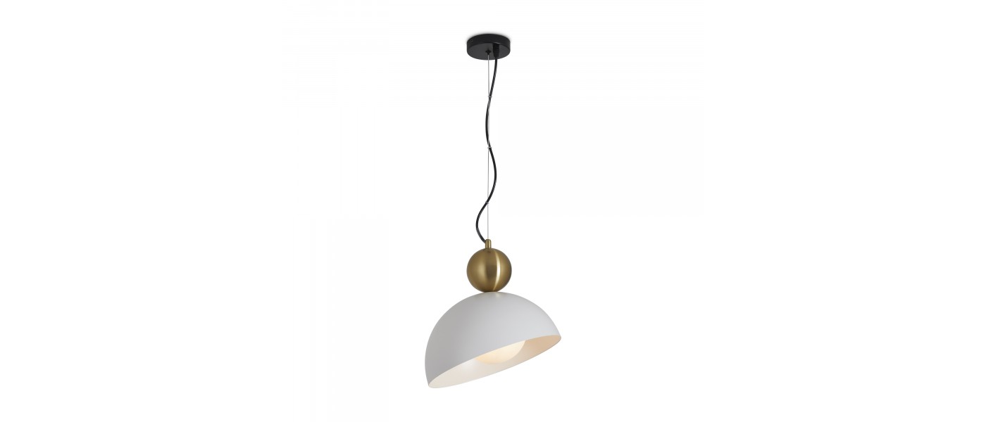 Арматура металл. Цвет арматуры матовый черный, белый. Плафоны металл. Внутри с шаровидным белым плафонов для рассеянного света. Плафоны имеют смещенный центр для крепления, украшены декоративным округлым элементом в латунном оттенке. Источник света лампа. Цоколь E27...
