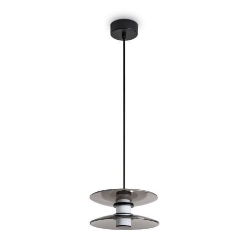 Материал арматуры — металл, цвет — черный. Плафоны выполнены из стекла дымчатого цвета. Светильники представлены в подвесном и напольном исполнении и оснащены LED-источником света с цветовой температурой 3000К. Сочетание металла и затемненного стекла создает выразительную атмосферу в современных инт..