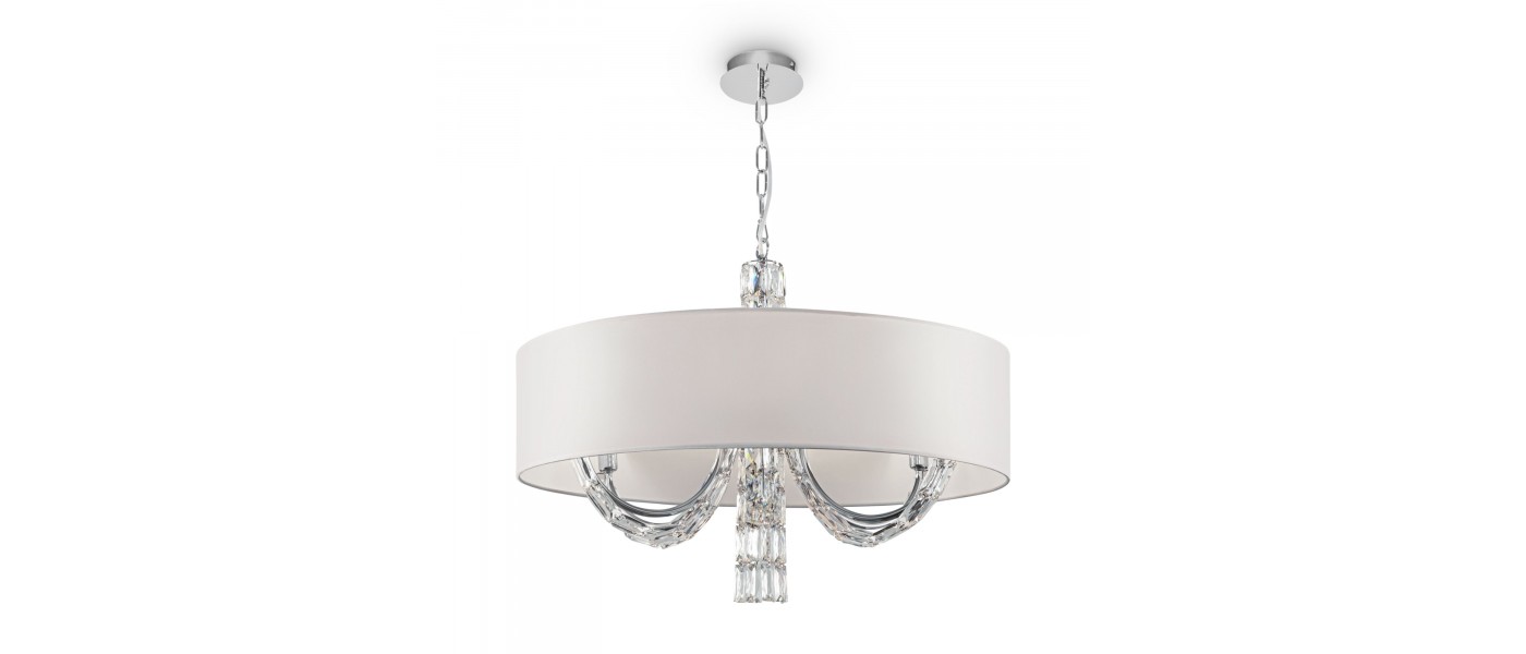 Арматура из металла, цвет – хром. Абажуры из текстиля, нанесенного на ПВХ. Цвет – белый. Декор – массивные кристаллы сложной огранки. Высота подвесных моделей регулируется...