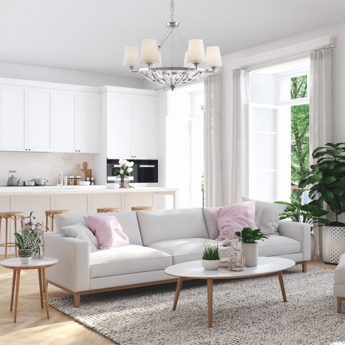 Металлическая арматура, два цвета – кремовый и коричневый. Просечной орнамент декорирует источники света. Настольная лампа и торшер с хлопковым абажуром. Часть моделей – с креплением 2 в 1. Высота люстр регулируется...