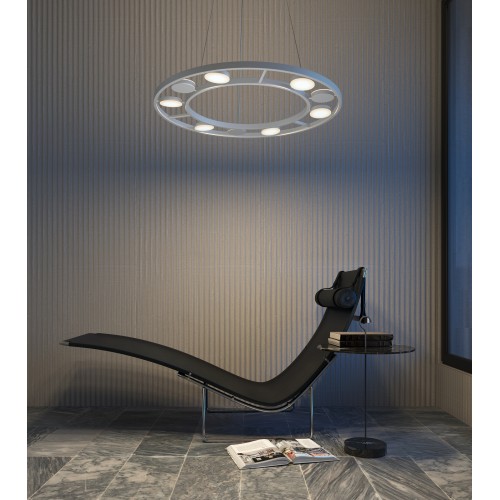 Плафоны и арматура из металла. Цвет рассеивателя — белый, арматура черная или белая. Конструкция предусматривает шарнирный механизм, позволяющий регулировать направление света и высоту светильников. Плафоны вращаются на 90 и 360° (в вертикальной и горизонтальной плоскостях). Угол рассеивания — 120 градусов. Тип света — рассеянный.