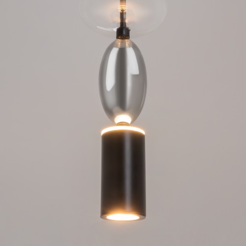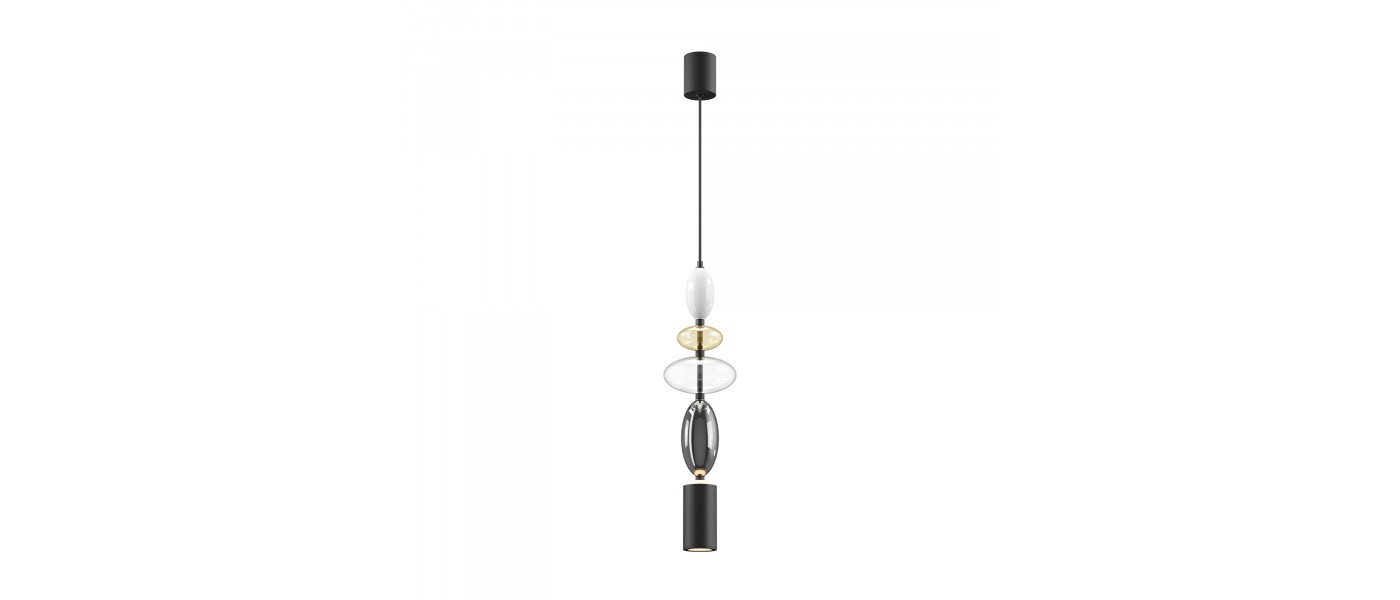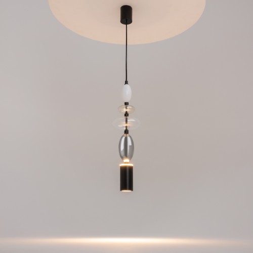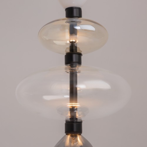 Черная металлическая арматура. Плафоны из стекла коньячного, белого, дымчатого цвета и прозрачный. Источник света комбинированный: нижний - съемная лампа с цоколем GU10, верхний - встроенный LED. Цветовая температура светильников 2700К, угол рассеивания света 120 градусов. Высота регулируется с помо..