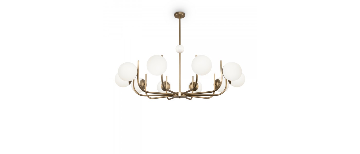 Арматура из металла окрашена в цвет латуни. Плафоны-сферы из матового белого стекла. Трендовые обтекаемые формы. Дизайн в стиле ретро. Источник света — лампы с цоколем Е14...