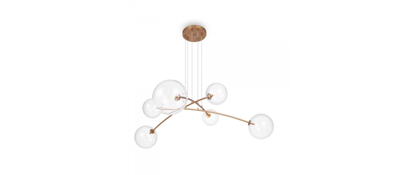 Материал арматуры - металл. Цвет - латунь, черный. Изящные линии арматуры, прозрачные плафоны из стекла в виде шара с миниатюрными лампами создают эффект воздушности светильников. Регулируемая высота подвесных светильников. Цоколь G4...