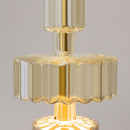 Арматура в цвете латуни. Плафоны и декоративные элементы стеклянные, цвет коньячный. Источник света: LED-светодиод. Цветовая температура — 3000К, угол рассеивания — 120 градусов. Регулируемый по длине провод 3 метра — для использования в помещениях с высокими потолками. 3 варианта дизайна плафонов д..