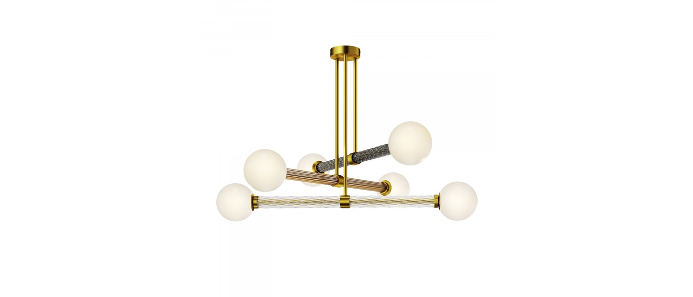 Два цветовых сочетания: сатинированная арматура из металла в цвете латунь в комбинации со стеклянными плафонами янтарного оттенка или трендовый черный хром с глянцевым финишем в сочетании с тонированными светло-серыми плафонами. Источник света: LED. Цветовая температура 3000К, угол рассеивания 120 г..