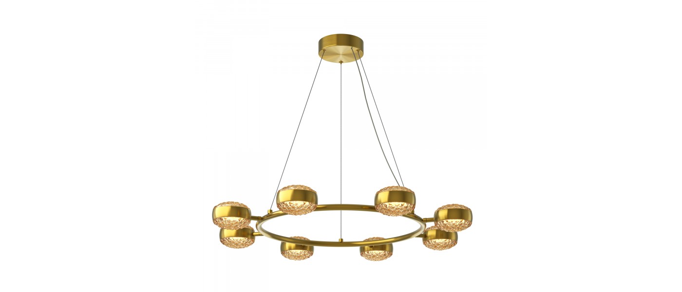 Два цветовых сочетания: сатинированная арматура из металла в цвете латунь в комбинации со стеклянными плафонами янтарного оттенка или трендовый черный хром с глянцевым финишем в сочетании с тонированными светло-серыми плафонами. Источник света: LED. Цветовая температура 3000К, угол рассеивания 120 г..
