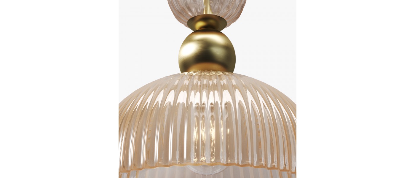 Металлическая арматура в цвете золота.Стеклянные плафоны нескольких цветов: коньячный, белый, серый. Рифленая поверхность стекла усиливает световые эффекты. Сменные источники света. Высота подвесных светильников регулируется сегментами штанги или с помощью трехметрового провода. Серия может использо..