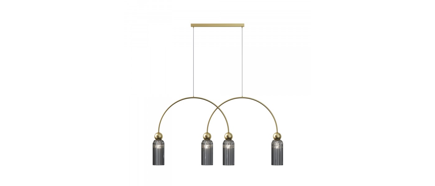 Металлическая арматура в цвете золота.Стеклянные плафоны нескольких цветов: коньячный, белый, серый. Рифленая поверхность стекла усиливает световые эффекты. Сменные источники света. Высота подвесных светильников регулируется сегментами штанги или с помощью трехметрового провода. Серия может использо..