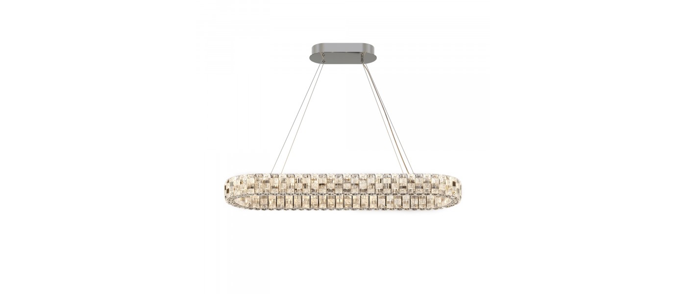 Металлическая арматура в двух вариантах цвета — хром или золото. Прозрачные декоративные элементы из хрустального стекла. Широкое кольцо снабжено LED-источником света. Цветовая температура потока излучения — 3000 К, угол рассеивания — 120 градусов. Регулируемый по высоте провод длиной 3 метра. Украш..