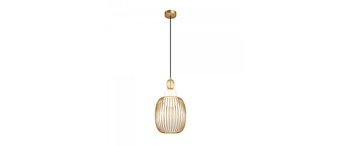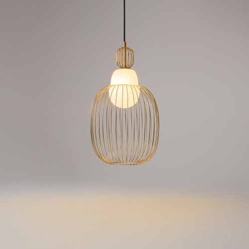 Цвет арматуры — латунь. Материал арматуры — металл. Абажур — каркас из проволоки, стекло. Оригинальный дизайн с эффектом левитации. Стеклянный рассеиватель со специальным выступом для крепления проволочного плафона. Два типа подвесных светильников: компактные со сменными лампами и крупный с LED-моду..
