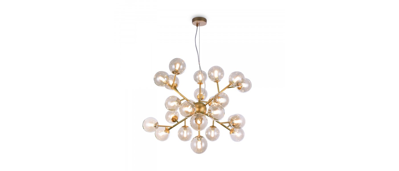 Металлическая арматура в четырех цветах: матовый черный, хром, золото, латунь. Плафоны — выдувное стекло. Цвета — дымчатый, янтарный, коньячный. Дизайн с имитацией молекулярной структуры. Высота подвесных светильников регулируется тросом. Лампа с цоколем G9...
