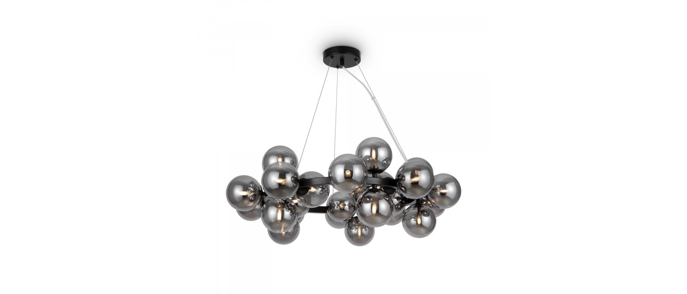 Металлическая арматура в четырех цветах: матовый черный, хром, золото, латунь. Плафоны — выдувное стекло. Цвета — дымчатый, янтарный, коньячный. Дизайн с имитацией молекулярной структуры. Высота подвесных светильников регулируется тросом. Лампа с цоколем G9...