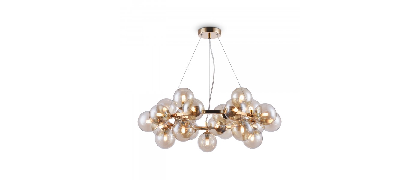 Металлическая арматура в четырех цветах: матовый черный, хром, золото, латунь. Плафоны — выдувное стекло. Цвета — дымчатый, янтарный, коньячный. Дизайн с имитацией молекулярной структуры. Высота подвесных светильников регулируется тросом. Лампа с цоколем G9...