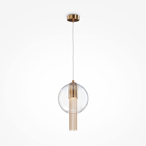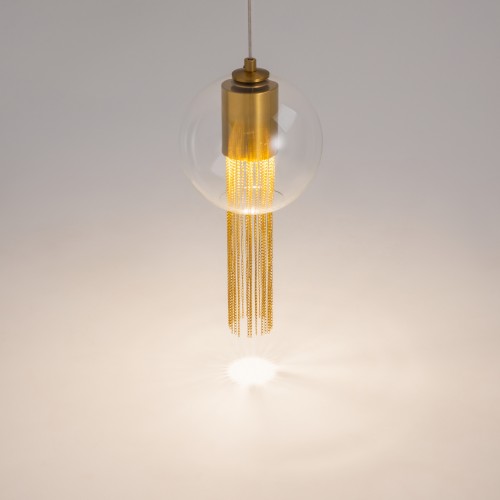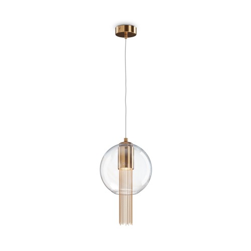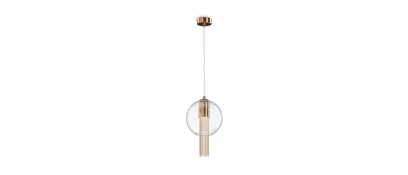 Металлическая арматура в бронзовом оттенке. Плафон-сфера – прозрачное выдувное стекло. Декор – подвесные цепочки внутри плафона. Скрытый источник света...